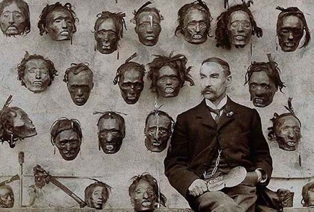 Severed human heads always have the capacity of drawing people’s attention, right? Here we have a huge collection of mokomokai, or tattooed Maori heads, and the man sitting with them is Major-General Horatio Gordon Robley. He was a British officer who was stationed in New Zealand during the New Zealand Wars, during the second half of the 19th century. As an artist and as an antiques collector, he became fascinated with Maori tattoos and these mokomokai. After the wars, the art and tradition of these tattooed heads disappeared among the Maori people of the islands, but before the arrival of the Europeans, these denoted a high social status. Now, even though predominantly males wore these tattoos on their entire faces, women of prominence had them on their lips and chin. These symbolized the wearer’s connection with the ancestors.