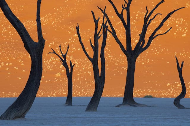 It’s not so easy to tell whether this is a photograph or a painting, right? Now, it does resemble a somewhat alien and surreal painting, with the trees looking almost like silhouettes and the color contrasts faintly resembling something by Edvard Munch. But no, it’s a real picture taken by photographer Frans Lanting while on an assignment by National Geographic to Namibia. The photo was taken in the early morning, just as the sun was rising over the horizon and flooding the orange sand dune in the backdrop. The barren ground in front is still under the partial cover of darkness, having a slightly bluish tint, reflecting the sky above.